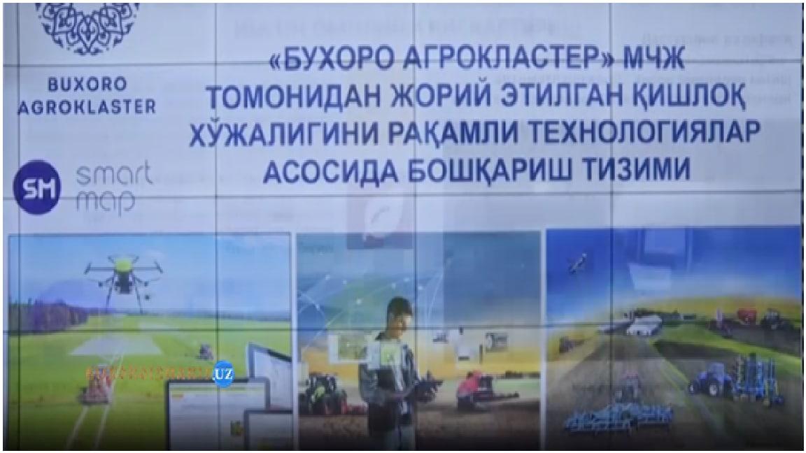 21 январь куни Бухоро шахридаги Давлат хизматлари марказида жойлашган IT-PARKда ўтказилган тадбирлар давомида Шавкат Мирзиёев иштирокида “Бухоро Агрокластер” МЧЖнинг “Бухоро вилоятида қишлоқ хўжалигини рақамли технологиялар асосида бошқариш тизими” тўғрисидаги тақдимоти ўтказилди.